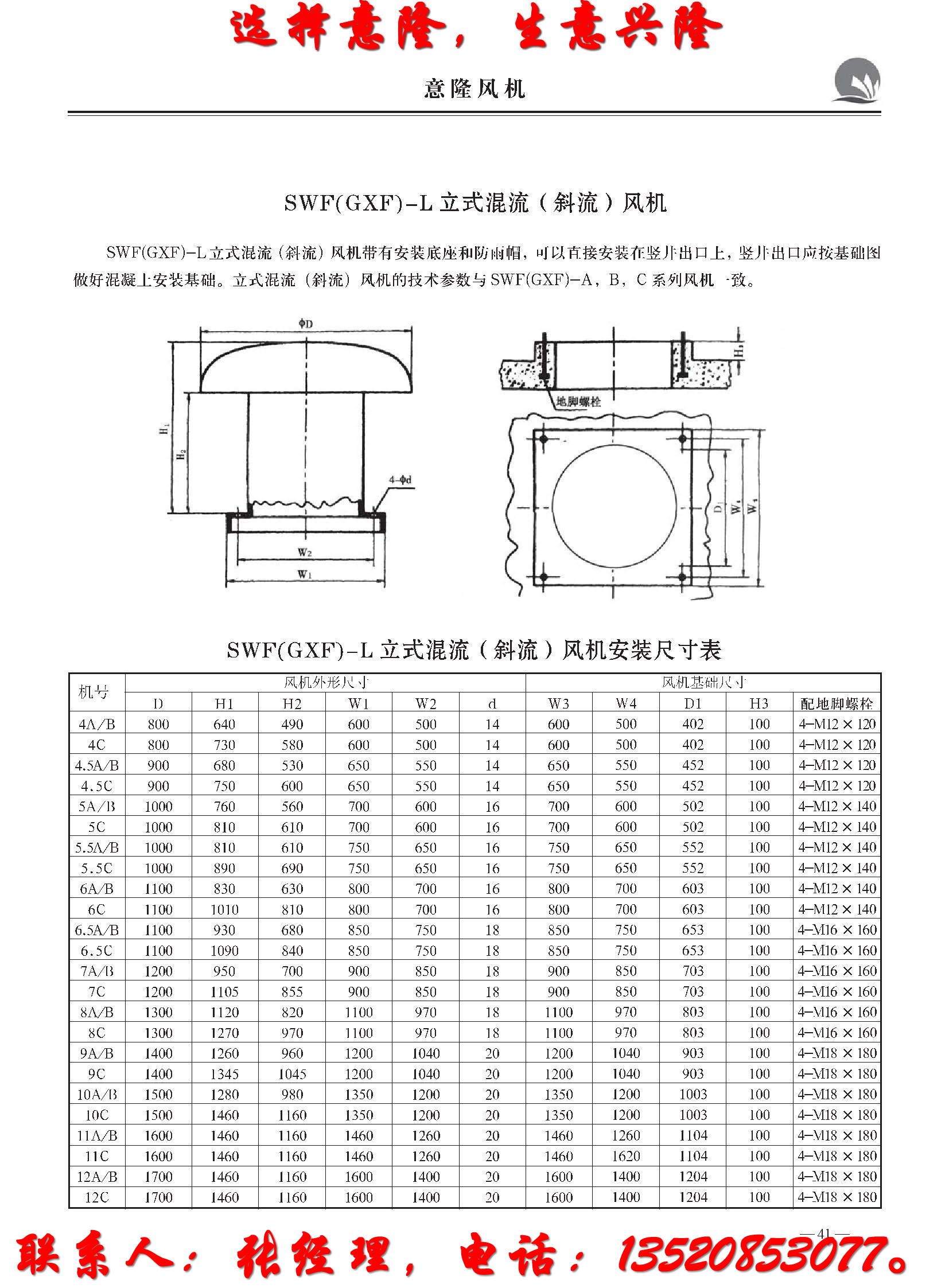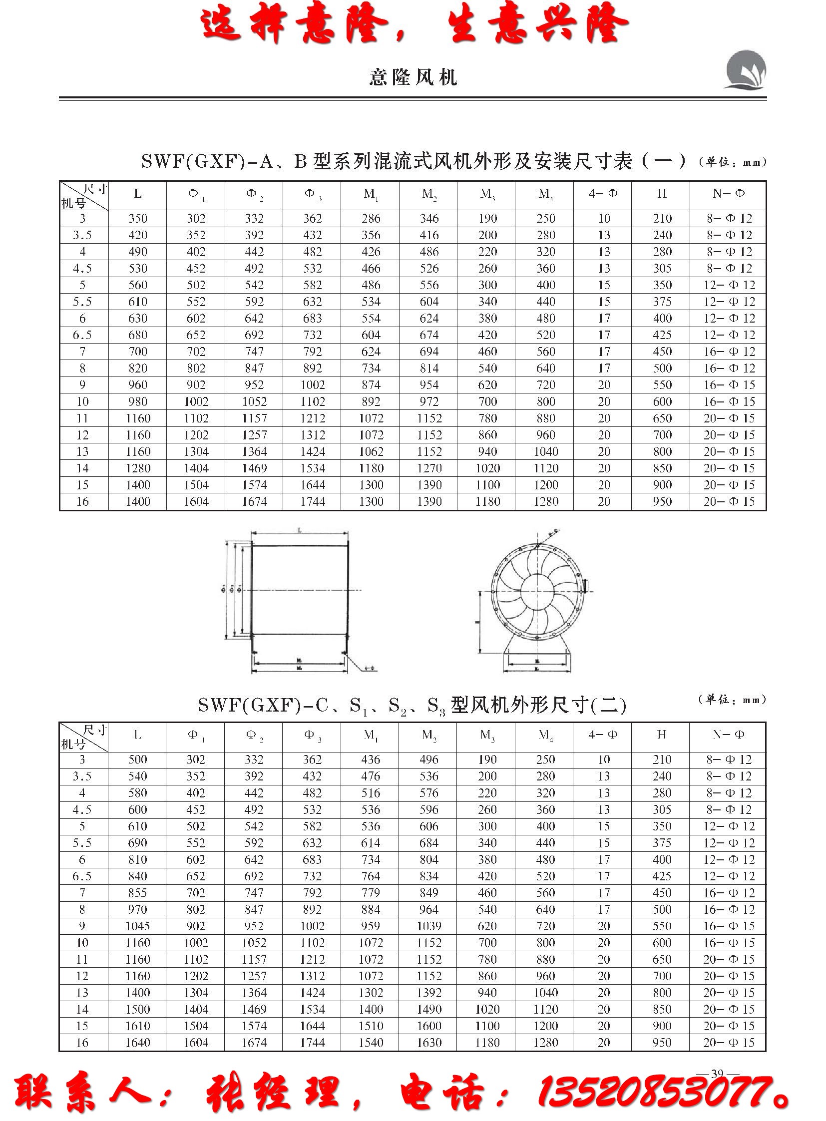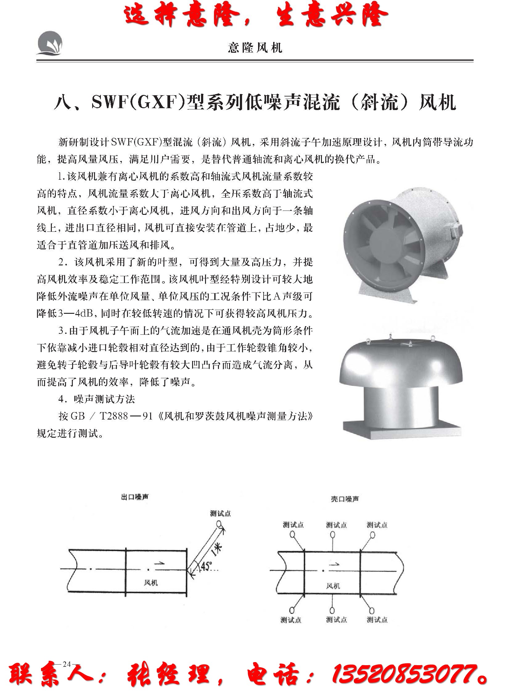 SWF/GXF型混流風機適用于工礦企業、高級民用建筑的排風,可替代低壓離心風機或替代高壓軸流風機而不需采用大量措施。該系列產品分單速和雙速二種型號。可在不同的場合用改變風機安裝角度,改變葉片數,改變轉速的方法達到使用的目的,A式傳動。該產品效率高,高效區寬,本機采用先進的CAD系統軟件并經多目標優化,性能顯示設計研制的高科技產品,應用斜流子午加速法,壓力較同機號軸流式高,風量較同機號離心式大;結構緊湊安裝方便,該風機在排同風壓風量情況下比軸流式和離心式體積小,可直接與風筒聯接,水平安裝或垂直安裝,也可在墻或支架上安裝;噪聲低。